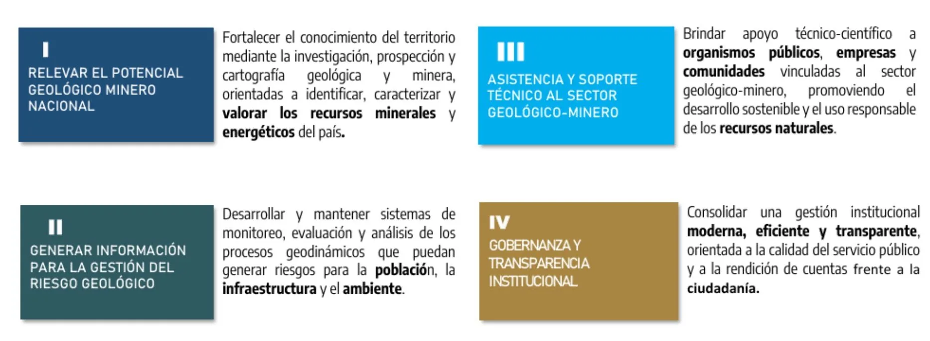 El Plan Estratégico 2025-2028 se estructura sobre cuatro grandes ejes: relevamiento del potencial geológico-minero, generación de información para la gestión del riesgo geológico, asistencia y soporte técnico al sector y fortalecimiento de la gobernanza y la transparencia institucional. Cada eje se descompone en objetivos estratégicos y metas medibles, con indicadores anuales de cartas geológicas, informes técnicos, servicios de laboratorio, convenios y productos digitales abiertos al público.