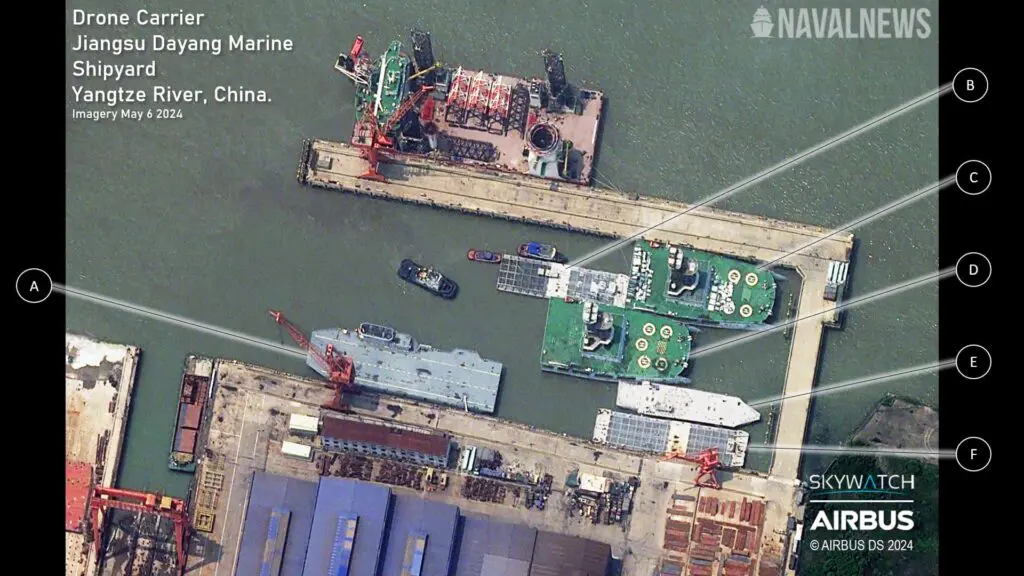 Siguiendo las imágenes viralizadas, donde se aprecia a este nuevo portadrones en las instalaciones del astillero Jiangsu Dayang Marine en el río Yangtze, ubicados en Shangai, muestran una imagen casi cenital del buque. La imagen permite apreciar las diferencias que esta clase de unidades tendrían con los portaaviones, al presentar un diseño cuadrangular con una cubierta de vuelo que representaría solo 1/3 comparada con los buques capitales mencionados. Por poner en comparación, estes buque podría poseer unas dimensiones y desplazamiento más cercanos a los antiguos portaaviones de escolta de la Segunda Guerra Mundial.