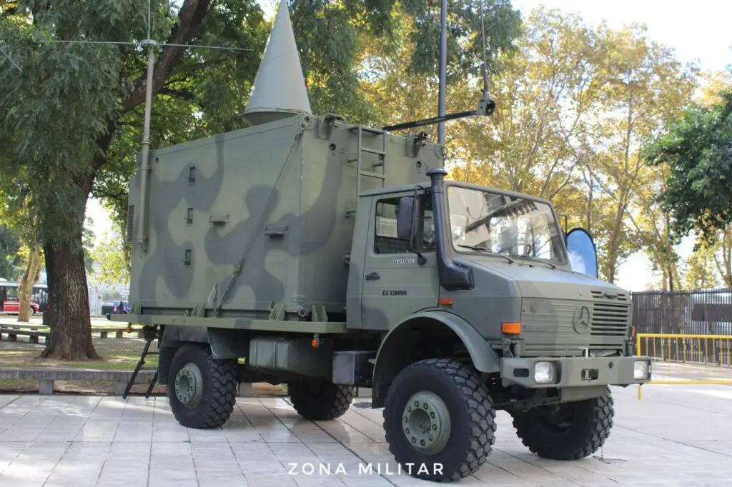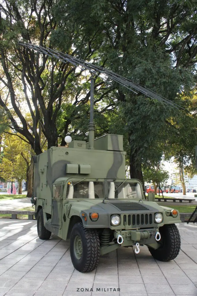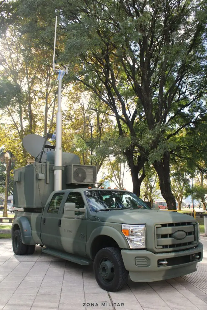 El Arma de Comunicaciones, presente en Expo Ejército 2024, desplegó a sus vehículos Ford F-350 Super Duty Super Cab, HMMWV y Unimog U2150L, equipados con antenas y sistemas de comunicaciones ubicados dentro de un modulo-shelter.