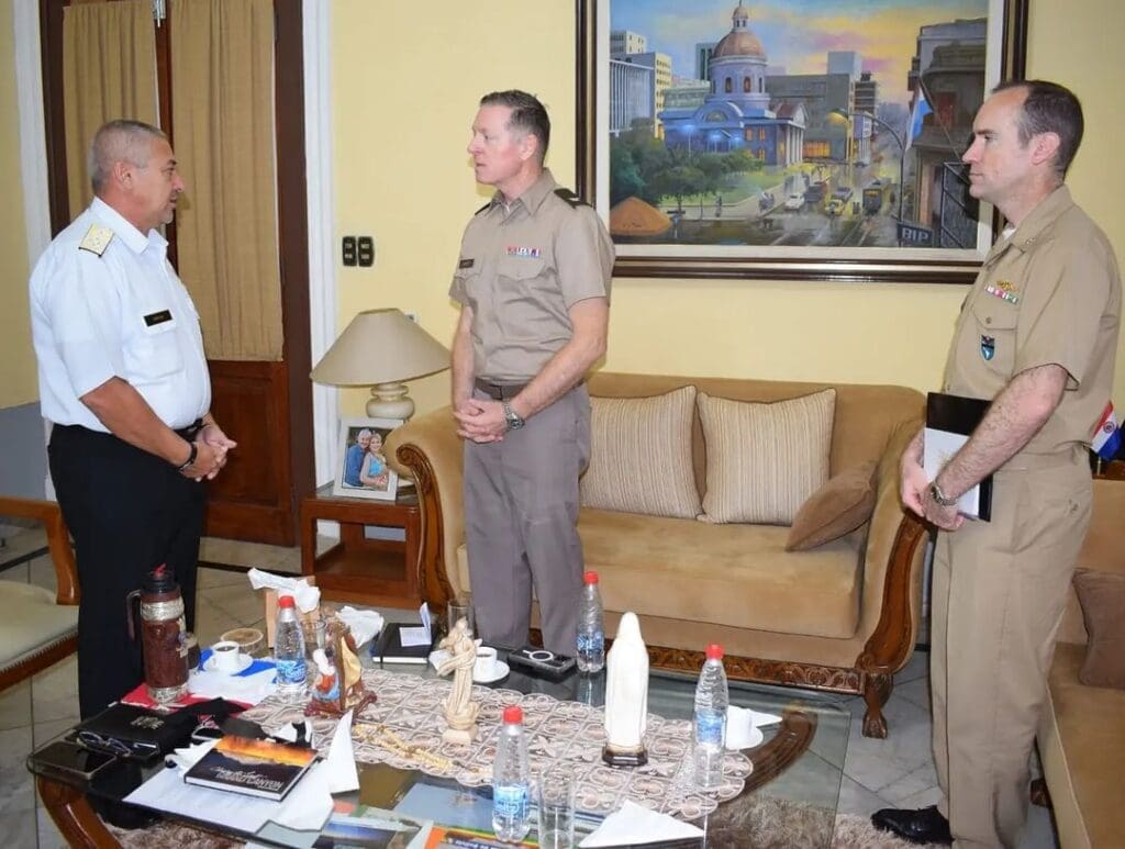 El comandante de la Armada Paraguaya, almirante Silvio Vargas recibió en su comandancia a los miembros de la Oficina de Cooperación de Defensa de los Estados Unidos, coronel Lance Awbrey, jefe de Asuntos de Defensa y Agregado de Defensa; al capitán Stephen Rittermann, oficial de Enlace de la Armada en la Oficina de Cooperación de los Estados Unidos y el capitán Ariel Benítez, oficial de Enlace de la Armada Paraguaya ante la Oficina de Cooperación.