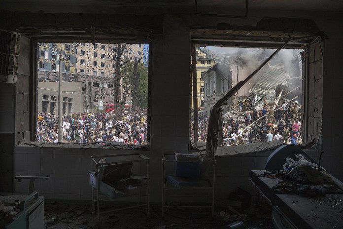 El impacto de un misil en el Hospital Infantil Okhmatdyt dejó una ala de dos plantas parcialmente destruida, con al menos 16 heridos, entre ellos siete niños. Las ventanas y puertas del edificio principal de 10 plantas fueron voladas por la explosión, y las paredes quedaron ennegrecidas por el humo.