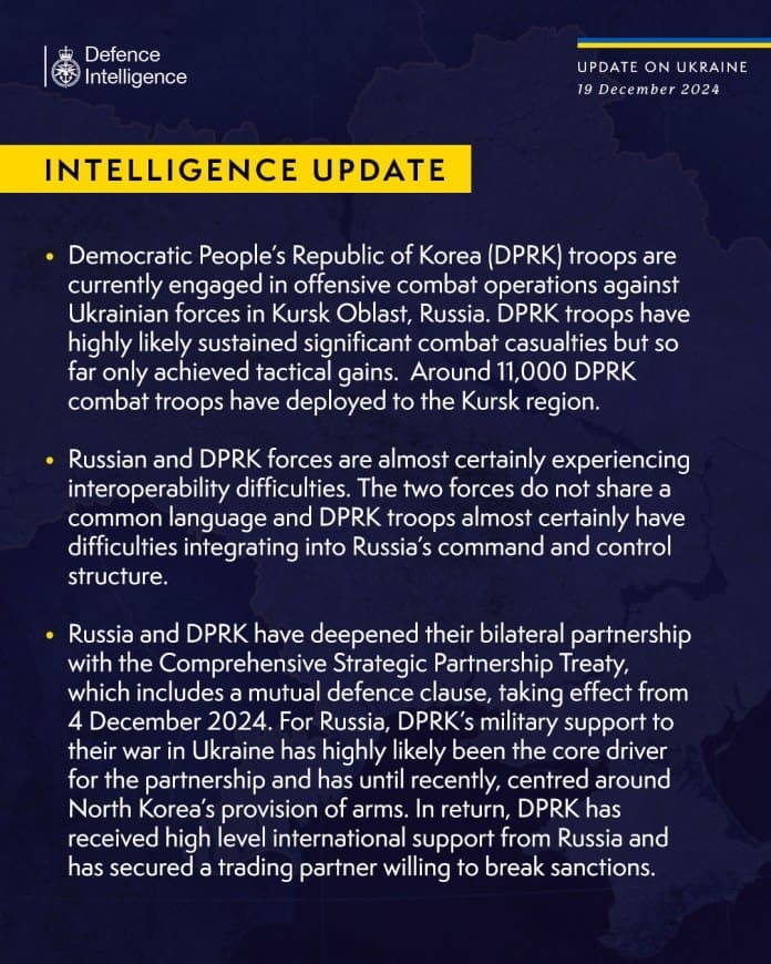 De acuerdo con la actualización publicada en la plataforma X (antes conocida como Twitter), alrededor de 11.000 soldados de la República Popular Democrática de Corea (RPDC) han sido desplegados en Kursk, donde se han involucrado en operaciones ofensivas contra las fuerzas ucranianas.