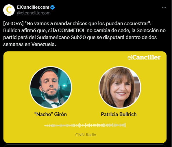 Este miércoles, la Ministro de Seguridad de Argentina, Patricia Bullrich, declaró sobre la participación de la selección de Argentina Sub-20 en el próximo Sudamericano, afirmando que no se enviará al grupo si se realiza en Venezuela. “No vamos a mandar chicos que los puedan secuestrar, tendrán que cambiar de sede”, habría destacado la funcionaria.