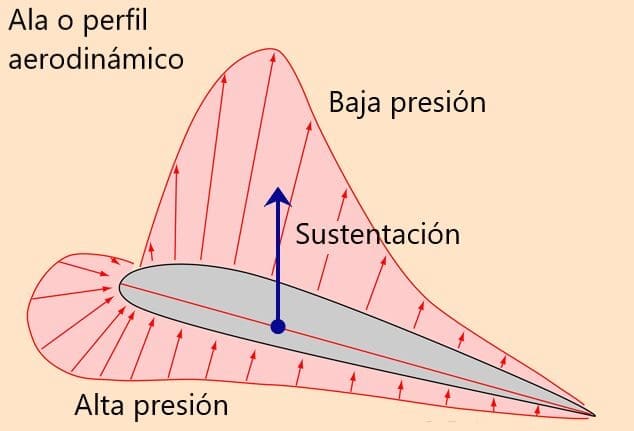 En un avión, la curvatura de las alas hace que el flujo de aire incidente se acelere sobre la parte superior, disminuyendo la presión. A su vez, el flujo de aire en la parte inferior es más lento y la presión aumenta. Se obtiene entonces una zona de baja presión en la parte de arriba del ala, y una zona de sobrepresión en la parte de abajo. Esta diferencia de presiones genera una resultante de fuerzas, la fuerza aerodinámica de sustentación, que es la que eleva al avión y lo mantiene en vuelo.
