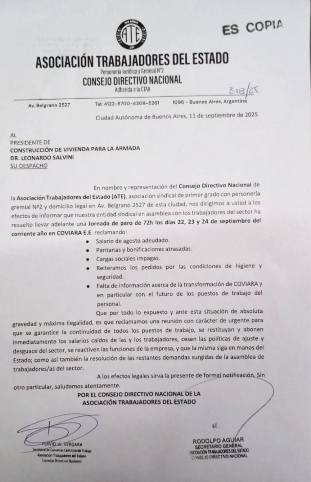 La Asociación de Trabajadores del Estado (ATE) confirmó un paro de 72 horas en Coviara, la empresa constructora de la Armada Argentina, para los días 22, 23 y 24 de septiembre, en una carta dirigida al presidente de la firma, Leonardo Salvini. La medida de fuerza surge en respuesta a los múltiples reclamos que se vienen realizando desde la planta trabajadora de Coviara desde hace meses, entre ellos los salarios adeudados, paritarias congeladas, bonificaciones atrasadas, cargas sociales impagas, condiciones de higiene deficientes y falta de información sobre el futuro de la empresa.