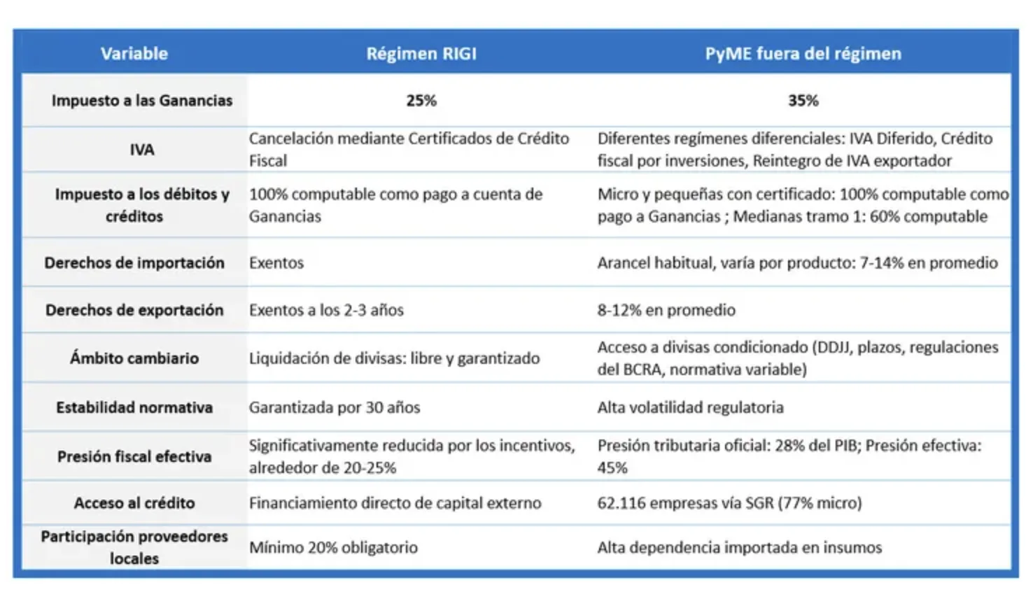 En este escenario, las pequeñas y medianas empresas argentinas operan bajo una coyuntura local que combina alta presión tributaria e impositiva, dificultades de financiamiento y acceso al crédito, extensa burocracia, significativos costos y alta volatilidad regulatoria, lo que las posiciona en una situación de completa desventaja, frente a las corporaciones globales que acceden al RIGI y promueven el desarrollo productivo en el territorio nacional, tal como evidencia la tabla adjunta a continuación. El Régimen frena, en cierto punto, el crecimiento local de un sector tan estratégico, como lo son las PyMES en la Argentina, que representan el 99% del tejido empresarial del país y concentran más del 60% del empleo formal.